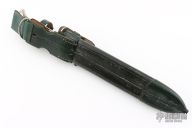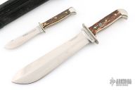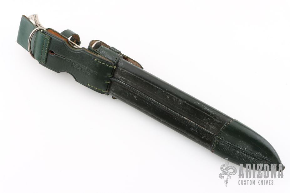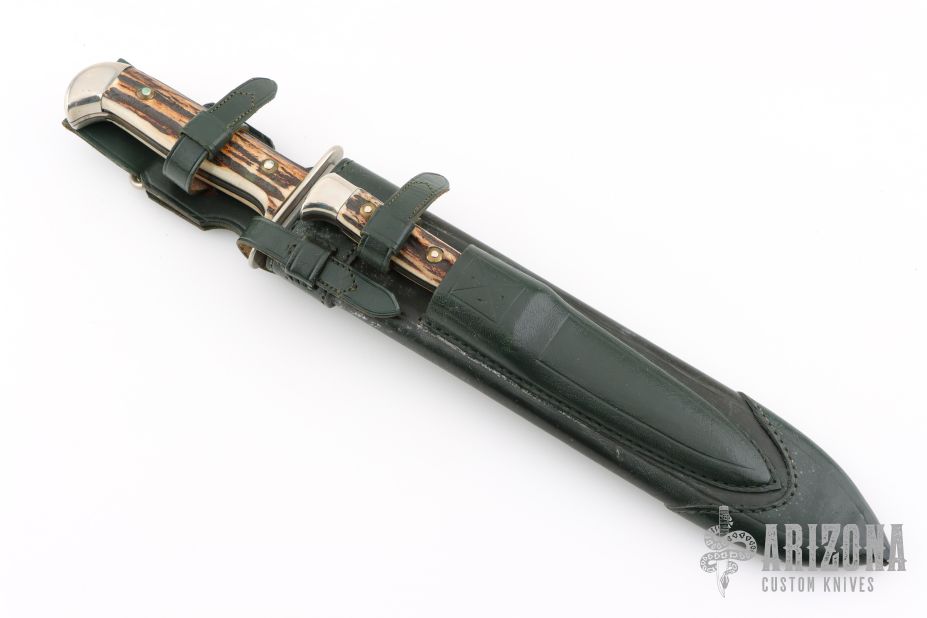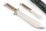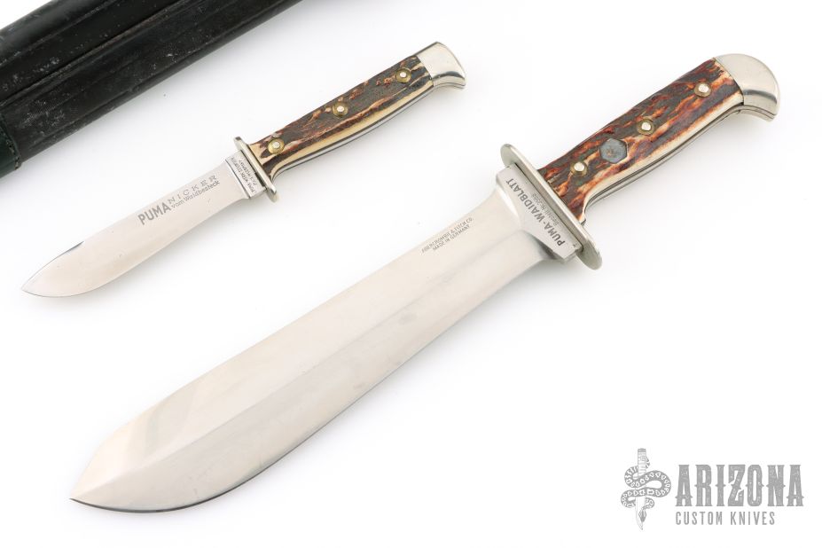 This Abercrombie & Fitch Co. Puma Super Set features two fixed blade knives and the original leather sheath. The set contains both a Waidblatt and a Nicker model. The Waidblatt features a satin finished blade with 1" sharpened top edge, .305" blade stock and 1.755" blade depth, full tang construction. 8.5" blade and 12.75" overall. The handle has a nickel silver guard and rear bolsters, stag scales over brass and black fiber liners, 800 silver escutcheon. Has some light hazing on the blade and some light sheath scratches, otherwise excellent condition. The Nicker features a satin finished blade with false top edge, .149" blade stock and .816" blade depth, full tang construction. 4" blade and 8" overall. The handle has a nickel silver guard and rear bolsters, stag scales over brass and black fiber liners. Has some light scratches, otherwise excellent condition. Both are marked Made in Germany. Both fit in a green leather sheath.