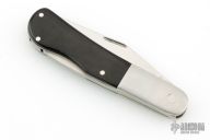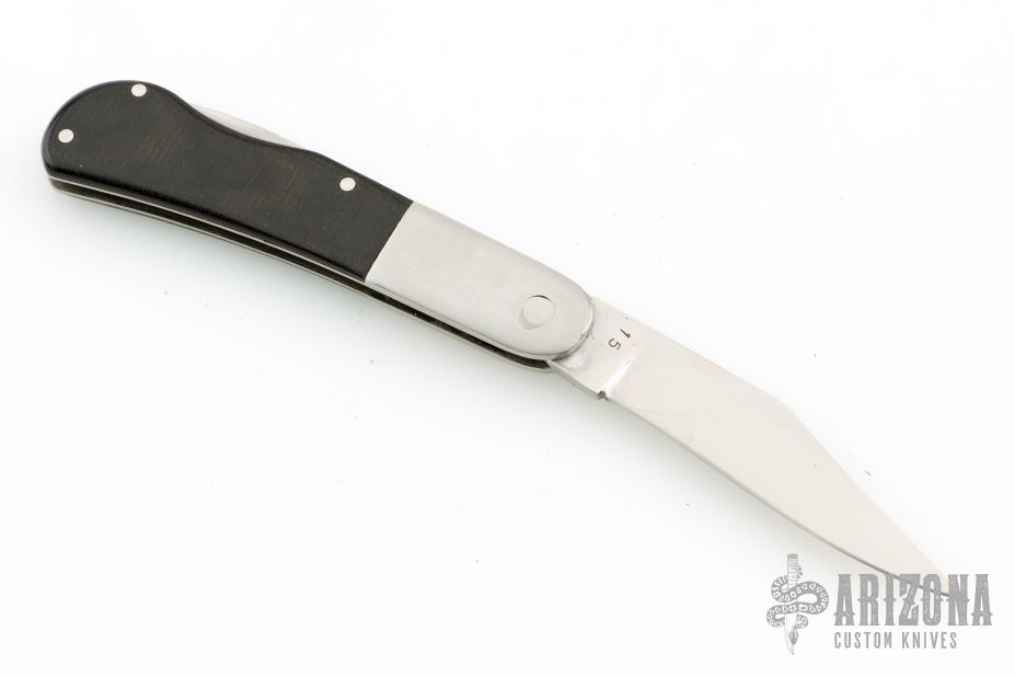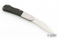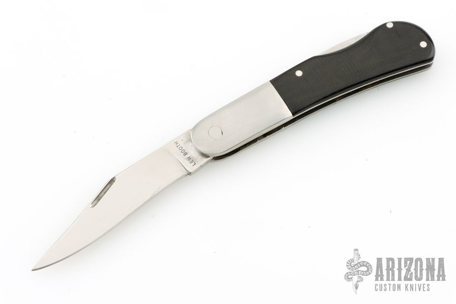 This lockback by Lew Booth features a satin finished blade with nail nick. The handle has satin finished stainless steel bolsters with integral liners, black linen micarta scales, stainless steel backspacer. #15 on the blade. Has some scratches, otherwise good condition.