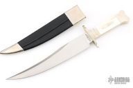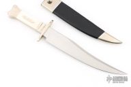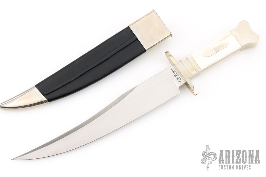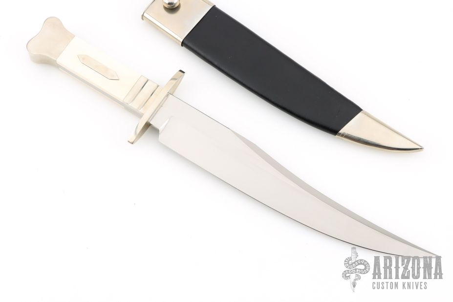 This bowie by Alex Daniels features a hand rub satin finished blade with a false top edge, .235" blade stock and 1.423" blade depth, hidden tang construction. The handle has a nickel silver guard and fluted bolsters, nickel silver dog bone butt. Comes with a black leather and nickel silver scabbard, the sheath has been cut through on the front and is very tight. Has a few light scratches, otherwise excellent condition.