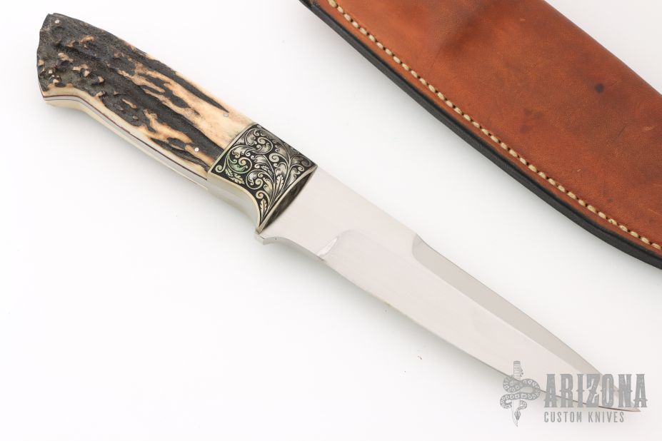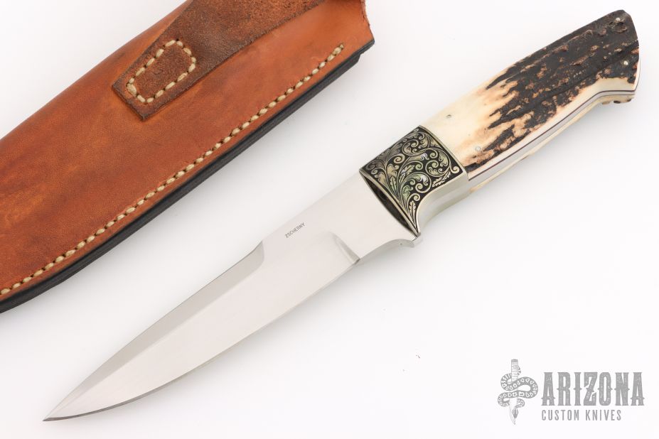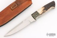 This knife by Mike Zscherny features a hand rub satin finished blade with top edge, .203" blade stock and 1.21" blade depth, tapered tang construction. The handle has engraved nickel silver dovetail bolsters, pinned stag scales with red liners. Includes leather belt sheath. Excellent condition.