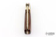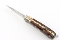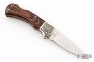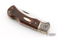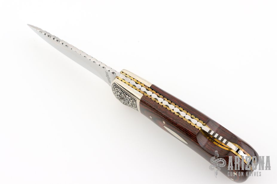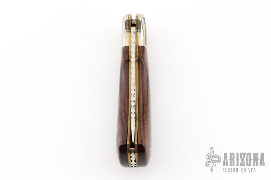 This Deer Field lockback by United States Cutlery blade with nail nick and fileworked spine. The handle has engraved nickel silver bolsters, dymondwood scales, fileworked brass liners and fileworked stainless steel backspacer. Has some light scratches, otherwise excellent condition.