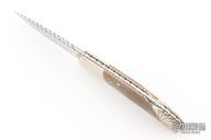 This Lockback by Ken Steigerwalt features a mirror polished blade with nail nick and fileworked spine. The handle has nickel silver bolsters, mammoth scales, nickel silver liners, fileworked stainless steel backspacer. Very classy little piece. Comes with a soft case. Has a couple light scratches, otherwise Excellent condition.