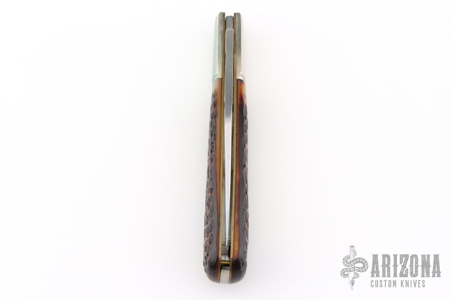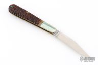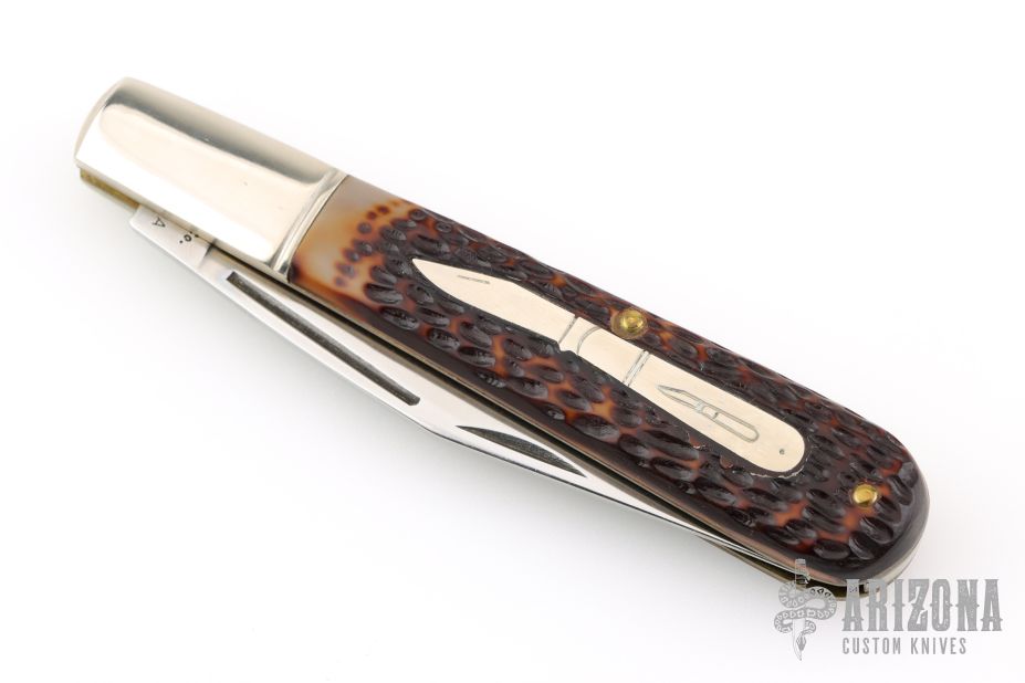 This Slipjoint from Camillus was made by AG Russell Company, it features a satin finished blade with nail nick. The handle has nickel silver bolsters and faux jigged bone covers with nickel silver escutcheon, brass liners and steel spring. Has light scratches, otherwise excellent condition.  #2923