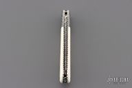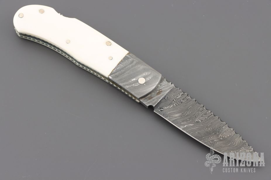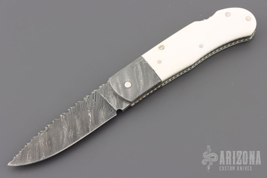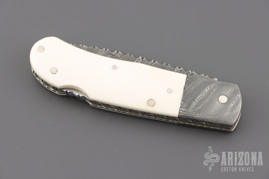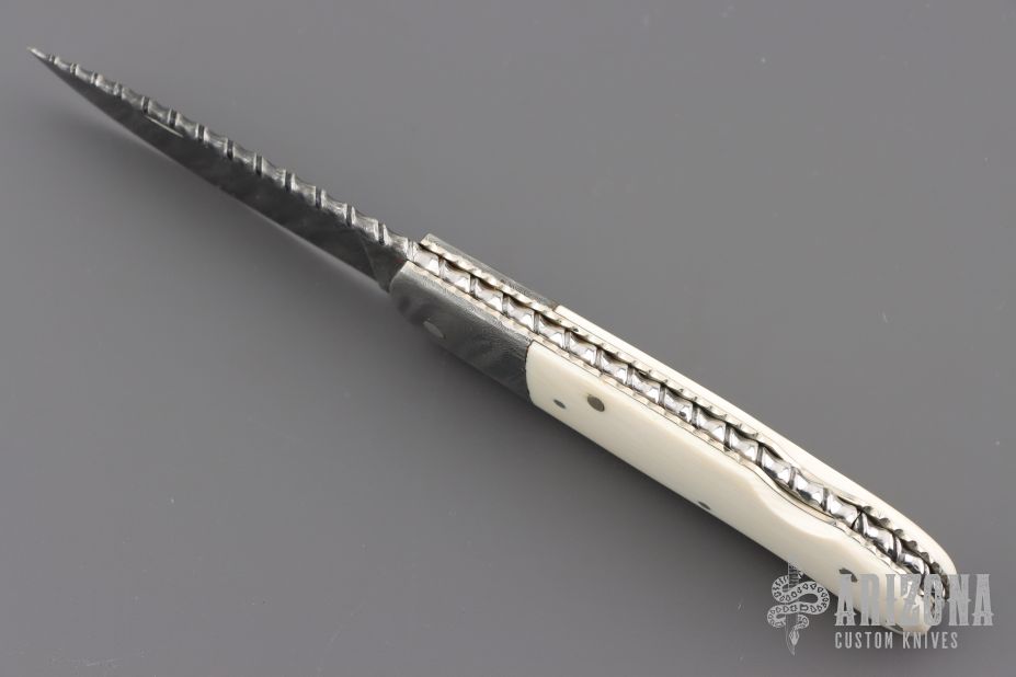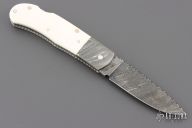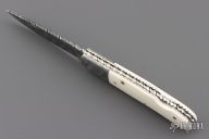 This Lockback by Ken Steigerwalt features a Damascus blade with nail nick and fileworked spine. The handle has Damascus bolsters, mammoth ivory scales, fileworked nickel silver liners, fileworked stainless steel backspacer. Nice lockup and blade seating. Excellent condition.