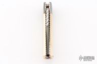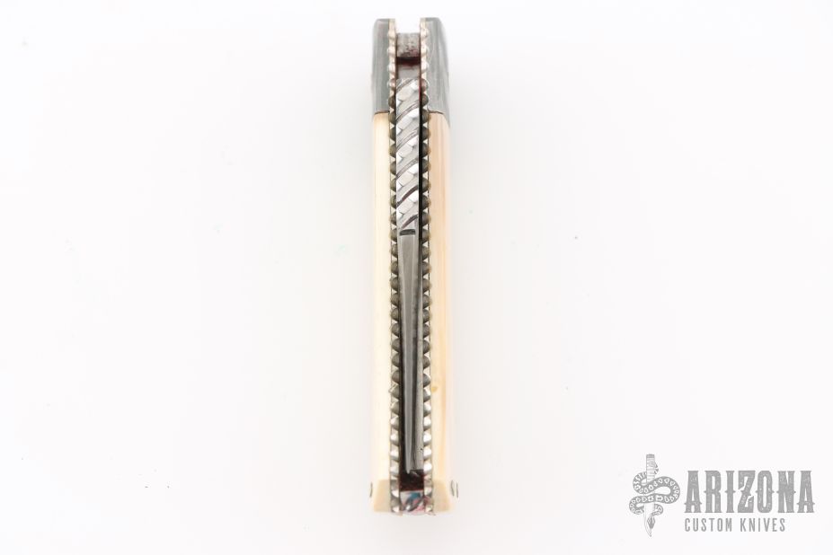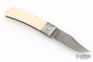 This Lockback by Ken Steigerwalt features a Damascus blade with a false top edge, nail nick, and fileworked spine. The handle has Damascus bolsters, mammoth scales, fileworked nickel silver liners, fileworked stainless steel backspacer. Very classy little piece. Comes with a soft case. Has a couple light scratches, otherwise Excellent condition.