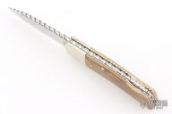 This Lockback by Ken Steigerwalt features a mirror polish finished blade with nail nick and fileworked spine. The handle has nickel silver bolsters, mammoth ivory scales, fileworked nickel silver liners, fileworked stainless steel backspacer. Nice lockup and blade seating. Comes in a soft pouch. Has a crack in the scale at the pin, on both sides. Besides this issue, the knife is in Excellent condition.