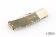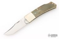 This Lockback by Ken Steigerwalt features a mirror finished blade with a false top edge, nail nick, and fileworked spine. The handle has integral nickel silver bolsters, mammoth scales, fileworked liners, fileworked stainless steel backspacer. Very classy little piece. Comes with a soft case. Has a couple light scratches, otherwise Excellent condition.