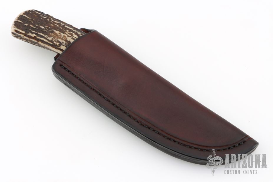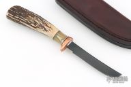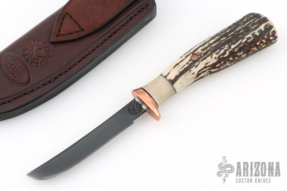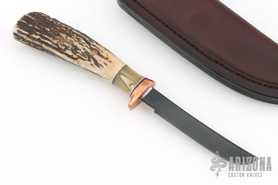 The Cunningham Custom Shop Upsweep is a timeless, all-purpose design built to handle anything from trout to moose—guaranteed. Hand-forged from 52100 round bar, it features a 3.75" blade with a razor-sharp convex grind and blued finish.  .117" Blade Stock.  .565" Blade Depth. The copper guard is soldered over classic spacer work, collaring musk ox horn and meeting premium sambar stag that’s copper-pinned through the tang. Measuring 8" overall, this piece comes with a top-tier custom pouch sheath from Grey Leather Co and a padded zippered case.  New from maker!