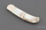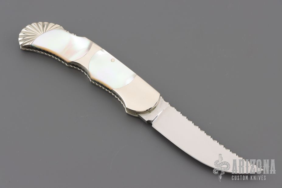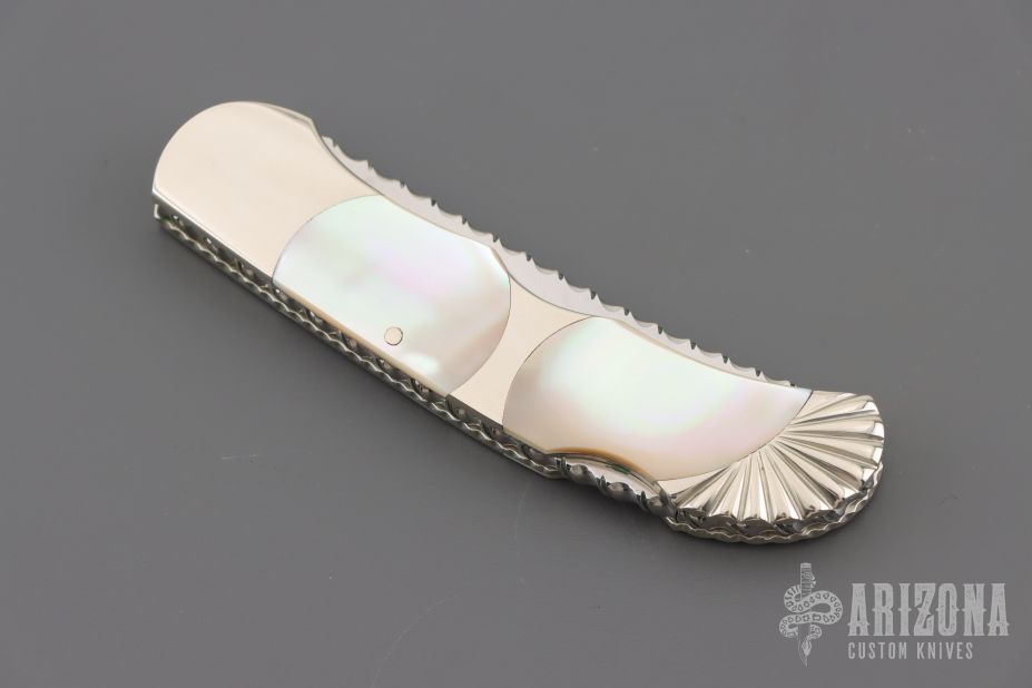 This Lockback by Ken Steigerwalt features a mirror polished blade with nail nick. The handle has nickel silver frame with mother of pearl inlays with fileworked stainless steel backspacer. Comes in a soft pouch. Has some light scuffs and scratches, excellent condition otherwise.