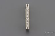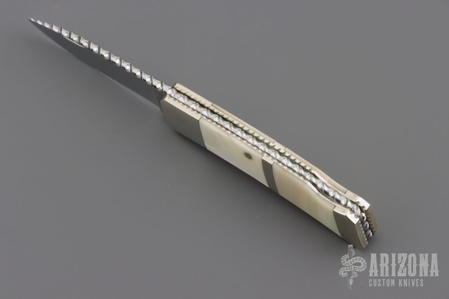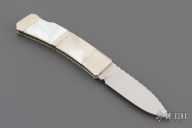 This Lockback by Ken Steigerwalt features a mirror finished blade with nail nick, and fileworked spine. The handle has nickel silver bolsters, pearl scales, fileworked liners, fileworked stainless steel backspacer. Very classy little piece. Comes with a soft case. Has a couple light scratches, otherwise Excellent condition.