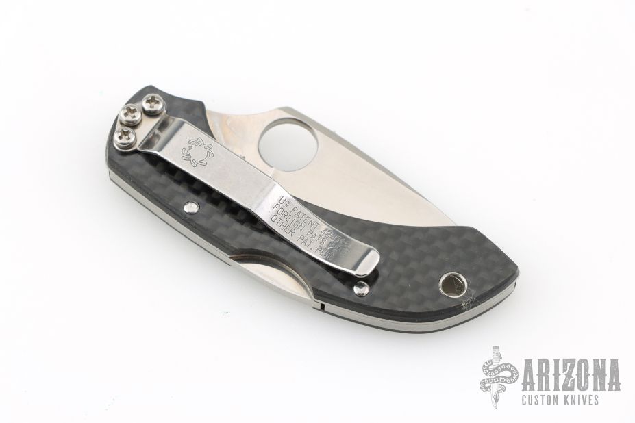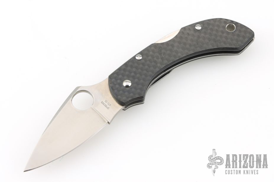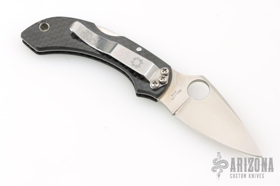 This Dragonfly by Spyderco features a satin finished blade with thumbhole. The handle has carbon fiber scales, stainless steel liner and backspacer, tip down stainless steel clip. Comes with original box and papers. New condition. RARE