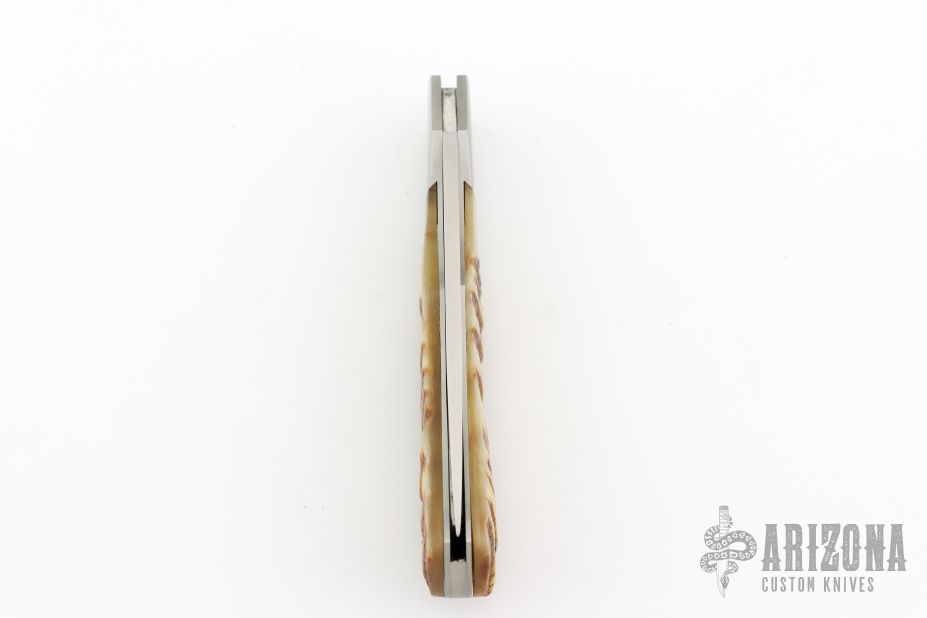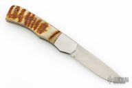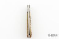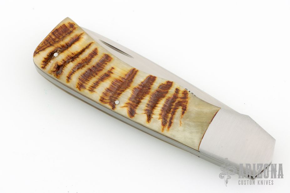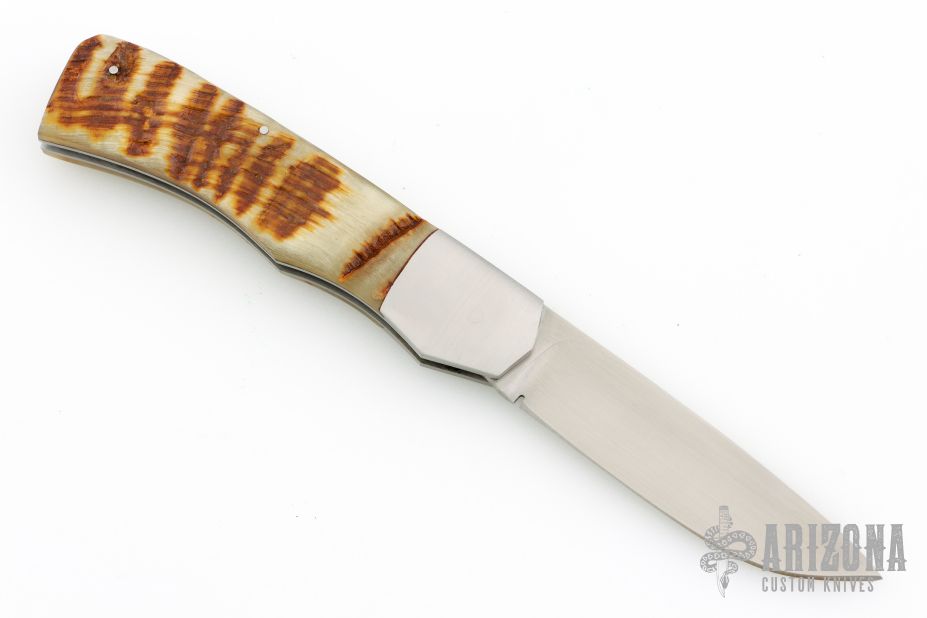 This slipjoint by Ron Gaston features a hand rub satin finished blade with nail nick. The handle has dovetailed and satin finished stainless steel bolsters, horn covers, stainless steel liners and spring. Half-stop, flush in the open and closed positions. Comes with a soft pouch. Has a couple light scuffs, excellent condition.