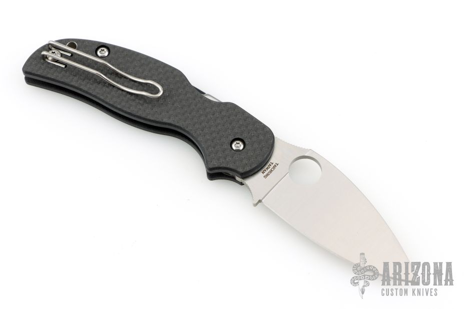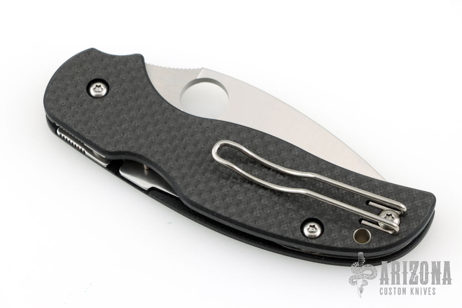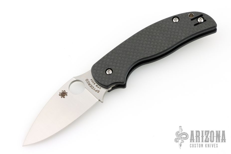 This Sage 5 by Spyderco Knives features a satin finished blade with thumb hole. Carbon fiber pattern G-10 scales, stainless steel liners. Comes with original box and papers. New condition.