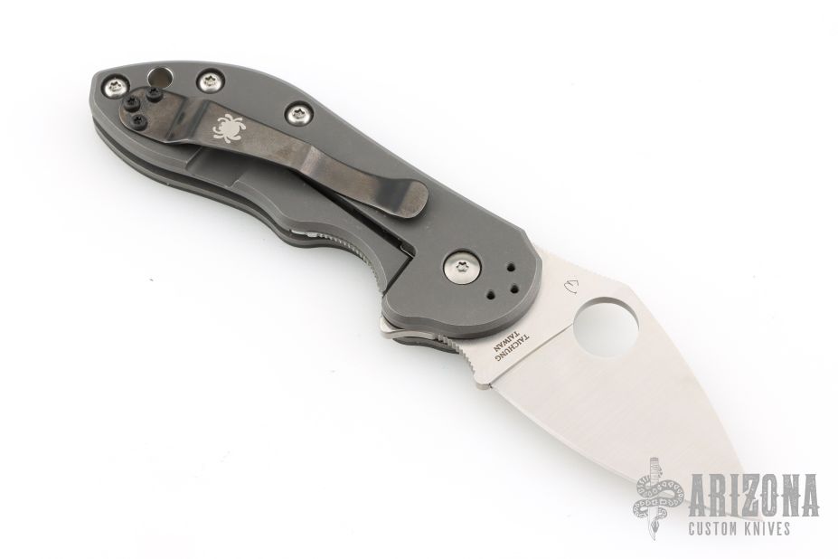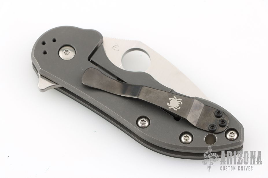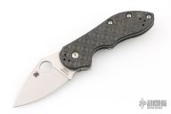 This Dice from Spyderco features a drop point blade with thumb hole and notched thumbrest and choil. The handle is comprised of a black carbon fiber scale on the presentation side over titanium frame. Black stainless steel tip up pocket clip and lanyard hole in pommel. Includes original box and papers. New condition.