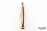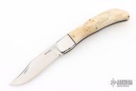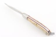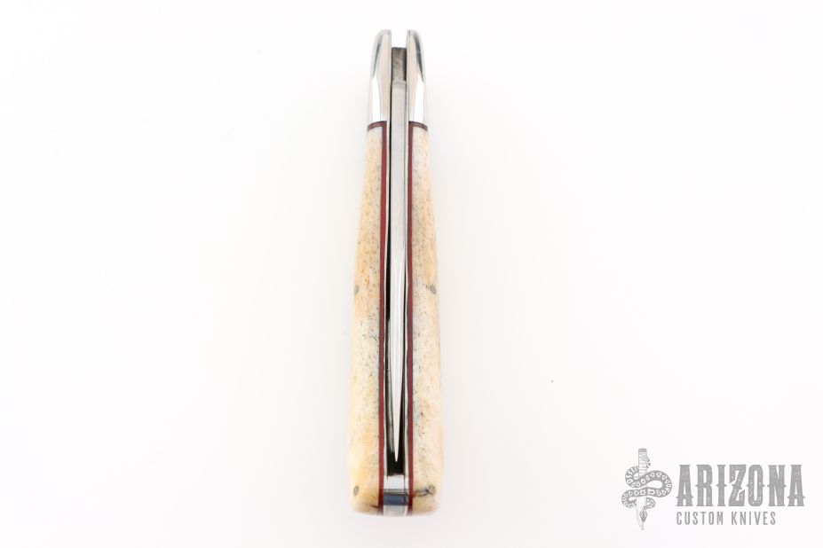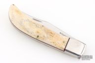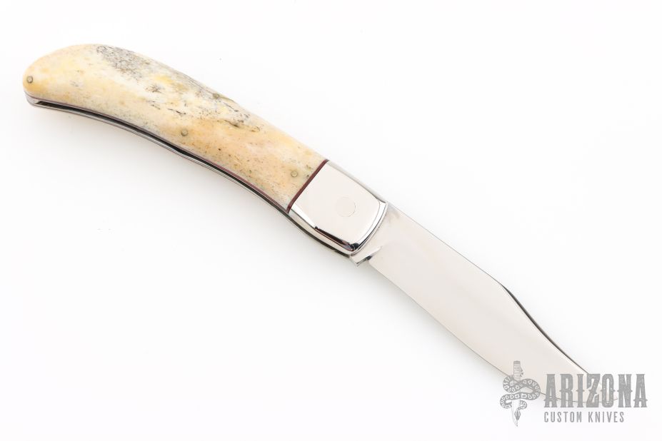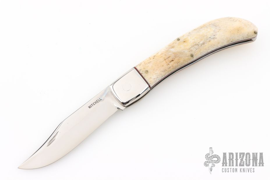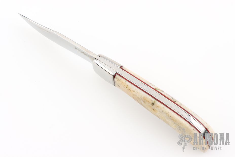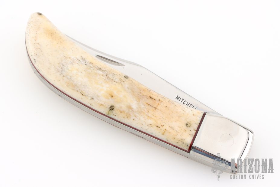 This is a Slipjoint Folder from Harry Mitchell and it features a mirror finished blade with nail nick. The handle has a nickel silver bolsters, nickel silver liners, smooth bone scales, red liners, and stainless steel spring. Nice blade seating and lockup. Comes in a soft pouch. Has a couple light scratches, excellent condition otherwise.