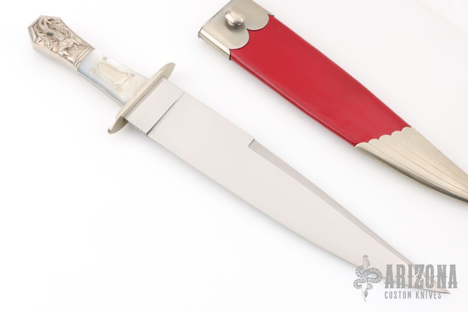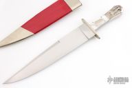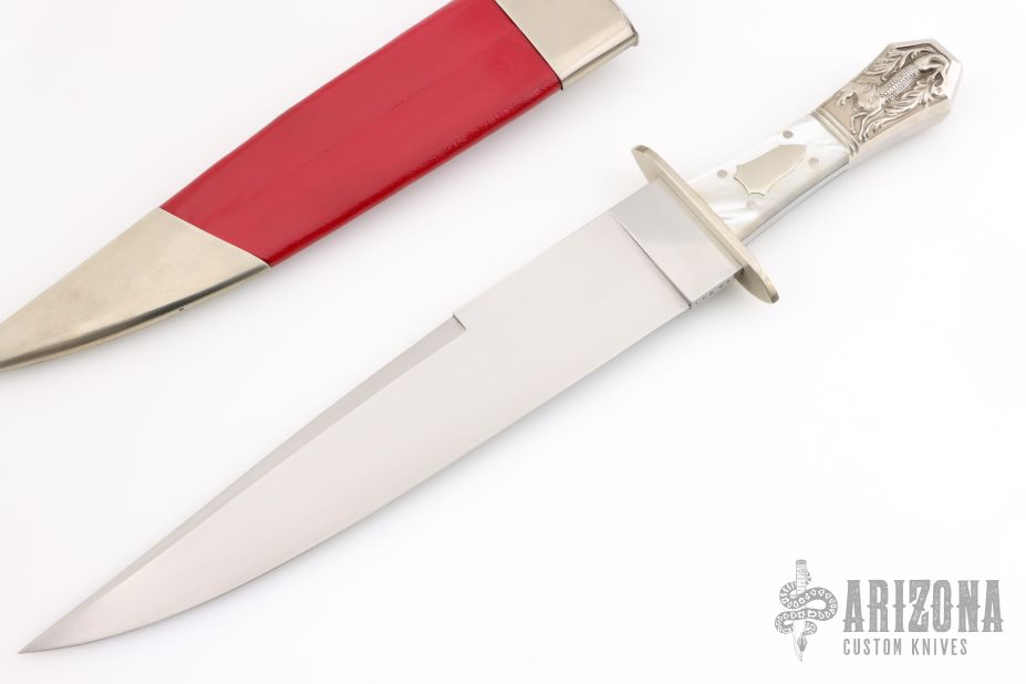 This Bowie by Larry Brandstetter features a hand rub satin finished blade with sharpened top edge, .243" blade stock and 1.786" blade depth, full tapered tang construction. The handle has a nickel silver guard and rear bolsters, mother of pearl scales with nickel silver escutcheon and pins. Comes with a nickel silver and red leather scabbard. Excellent condition. #026 under the ricasso