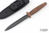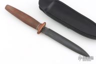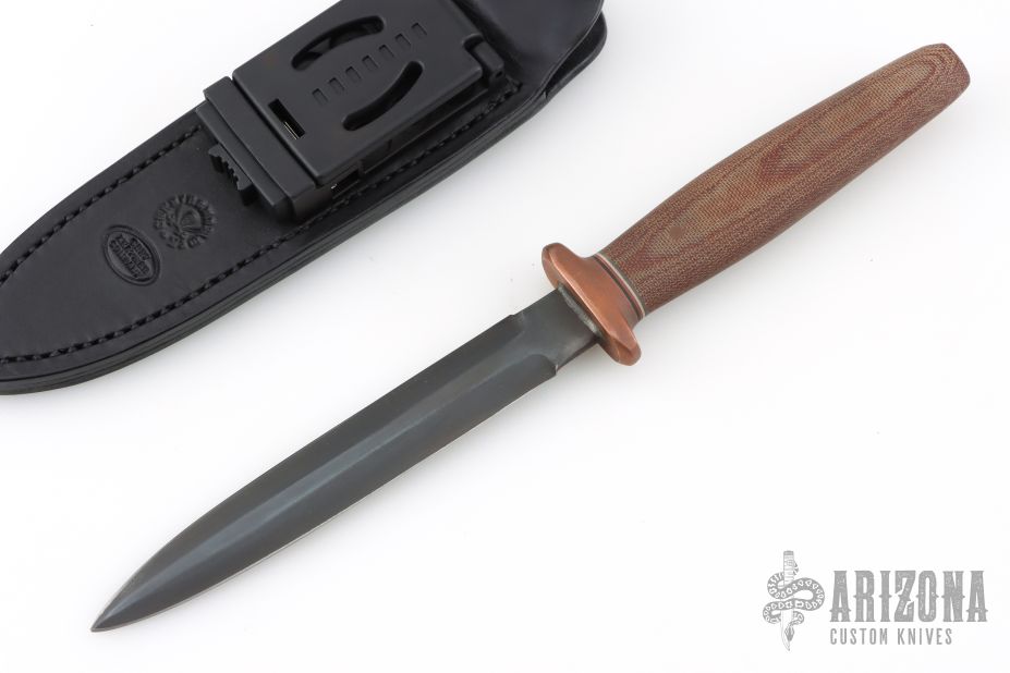 This badass Cunningham Custom Shop Stiletto draws inspiration from the legendary Fairbairn-Sykes fighting knife. Forged to shape from 52100 steel, it features a 5.5" blade with a razor-sharp double convex grind and a forced-patina blued finish.  .147" Blade Stock.  .802" Blade Depth. The copper guard is soldered in place over black, maroon, white, and slate vulcanized fiber spacers, leading into a natural canvas micarta handle pinned through the tang with copper. Measuring just over 10" overall, this combat-inspired masterpiece ships with a premium custom sheath from Grey Leather Co. of Eugene, Oregon.  Includes a padded zippered case. New from maker!