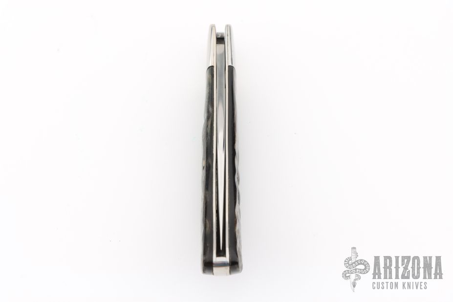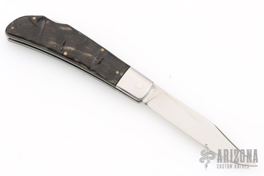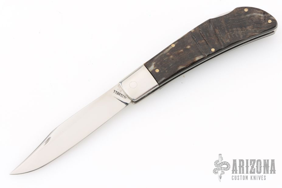 This is a Lockback Folder from Harry Mitchell and it features a mirror finished blade with nail nick. The handle has a nickel silver bolsters, nickel silver liners, horn scales and stainless steel backspacer. Nice blade seating and lockup. Comes in a soft pouch. Has a couple light scratches, excellent condition otherwise.