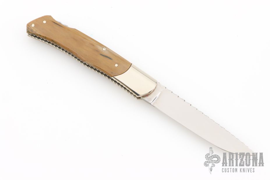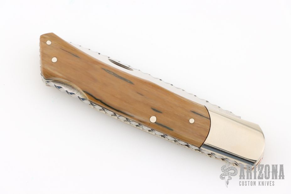 This Lockback by Ken Steigerwalt features a mirror polish finished blade with nail nick and fileworked spine. The handle has integral file worked nickel silver dovetail bolsters,  mammoth ivory scales, and fileworked stainless steel backspacer. Nice lockup and blade seating. Comes in a soft pouch. Has a small crack at one of the pins on both sides, otherwise Excellent condition.