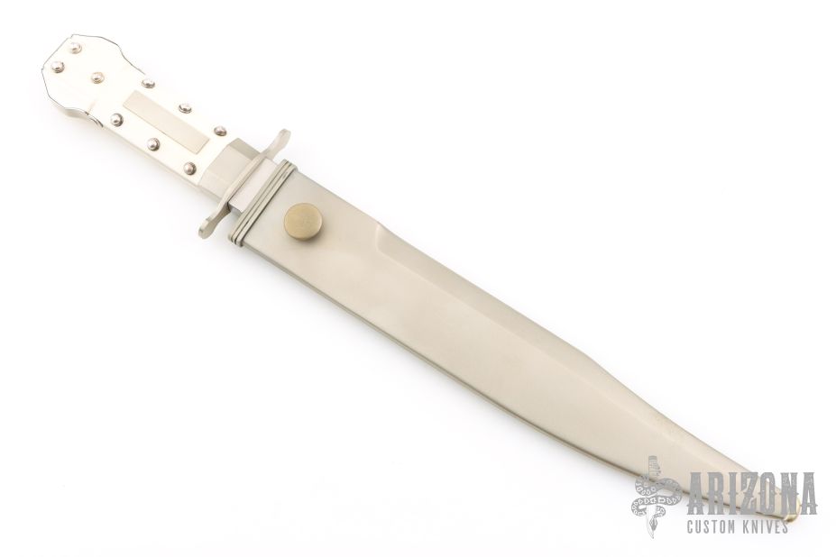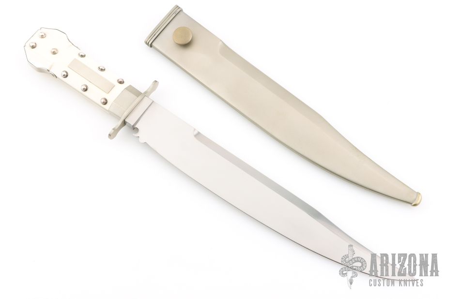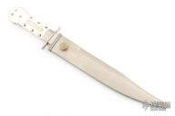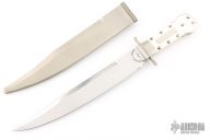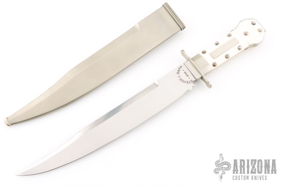 This Bowie by Steven J Rapp features a hand rub satin finished blade with a nearly sharpened top edge, .278" blade stock and 1.376" blade depth, hidden/frame tang construction. The handle has a nickel silver guard and frame with mammoth ivory inlays and nickel silver studs. Comes with a nickel silver scabbard. Excellent condition.