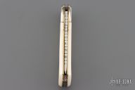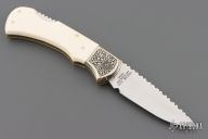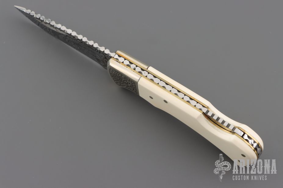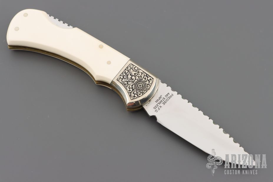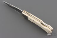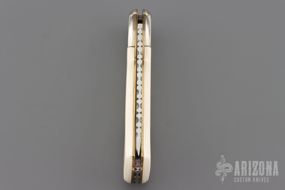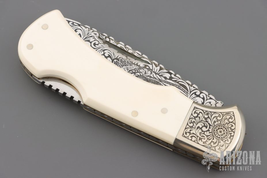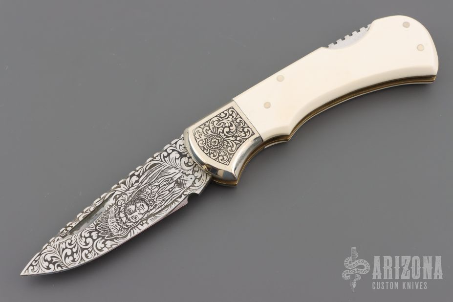 This Deer Slayer Lockback by Precise Knives features a mirror polished blade with fileworked spine and nail nick. The blade has an etching of an American Indian in a head dress. The handle has engraved nickel silver bolsters and brass liners, ivory paper micarta scales, fileworked steel backspacer. Excellent condition.