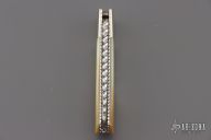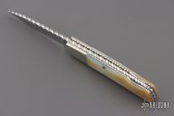 This Lockback by Ken Steigerwalt features a mirror finished blade with nail nick, and fileworked spine. The handle has nickel silver bolsters, gold lip pearl scales, fileworked liners, fileworked stainless steel backspacer. Very classy little piece. Comes with a soft case. Has a couple light scratches, otherwise Excellent condition.