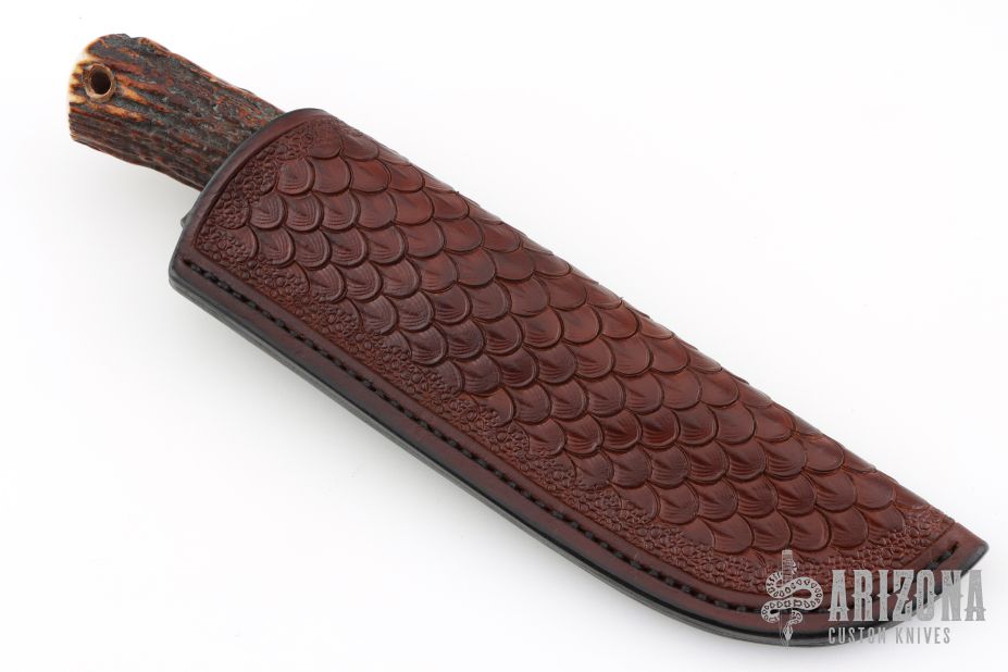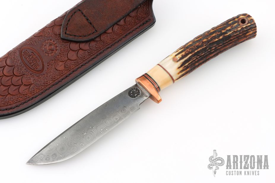 This stunning Drop Point from the Cunningham Custom Shop showcases 416-layer Damascus steel, expertly rolled with 5160 and 15N20 alloys in a striking raindrop pattern.  .110" Blade Stock.  1.045" Blade Depth.   The 4.5" blade features a razor-sharp convex grind and is joined via silver-solder to a copper guard. Black, maroon, and copper spacers frame exquisite fossil walrus ivory with tapioca exposure, complemented by a premium sambar stag handle that’s both pinned and thong-holed with copper. Measuring 9.25" overall, it comes with a custom dragon scale pouch sheath from Grey Leather Co.  Includes a padded zippered case.  New from maker!