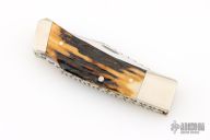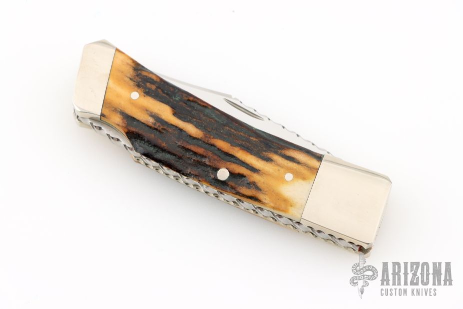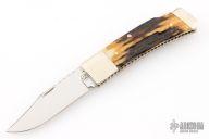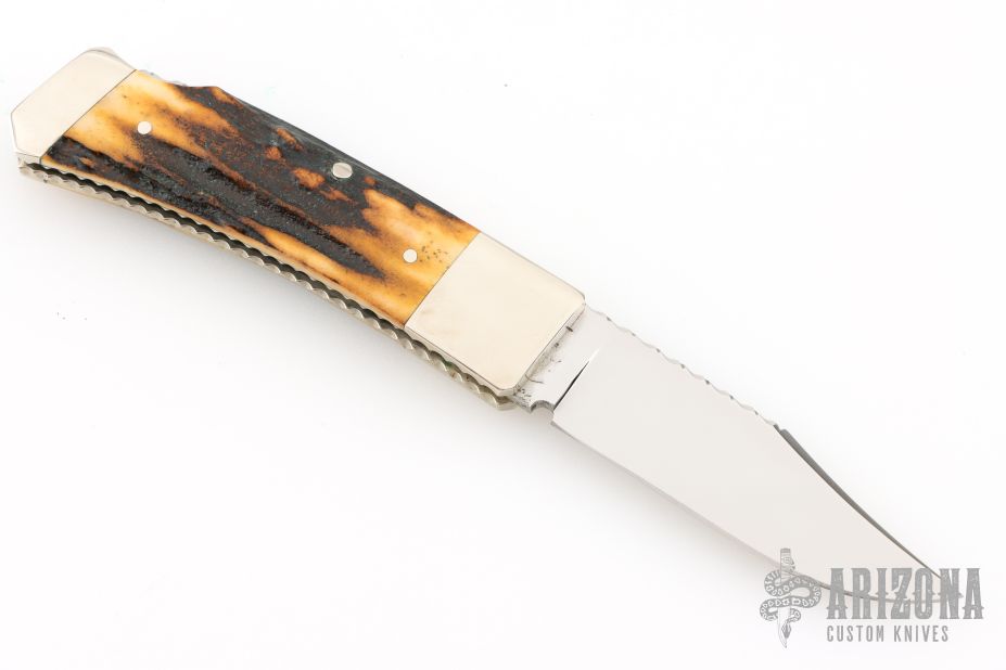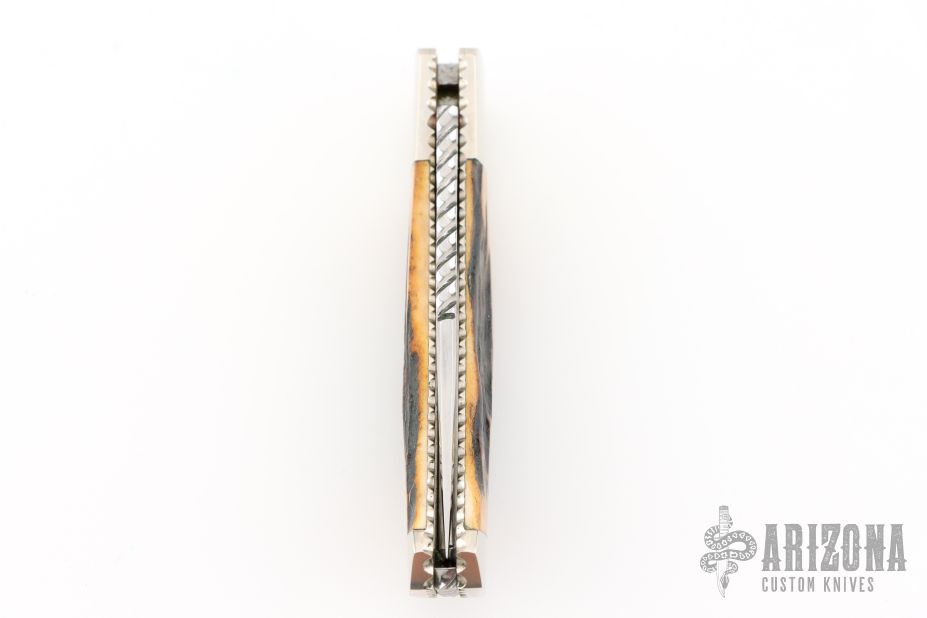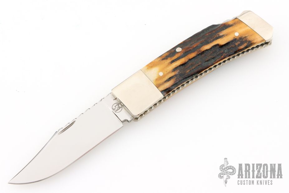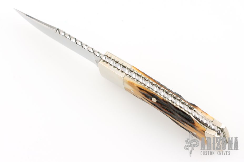 This Lockback by Ken Steigerwalt features a mirror finished blade with a false top edge, nail nick, and fileworked spine. The handle has integral nickel silver bolsters, stag scales, fileworked liners, fileworked stainless steel backspacer. Very classy little piece. Excellent condition.