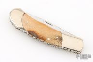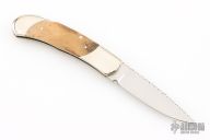 This Lockback by Ken Steigerwalt features a mirror polish finished blade with nail nick and fileworked spine. The handle has integral file worked nickel silver dovetail bolsters, mammoth ivory scales, and fileworked stainless steel backspacer. Nice lockup and blade seating. Comes in a soft pouch. Excellent condition.