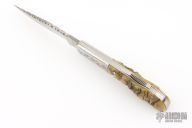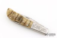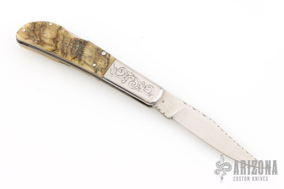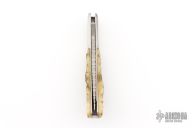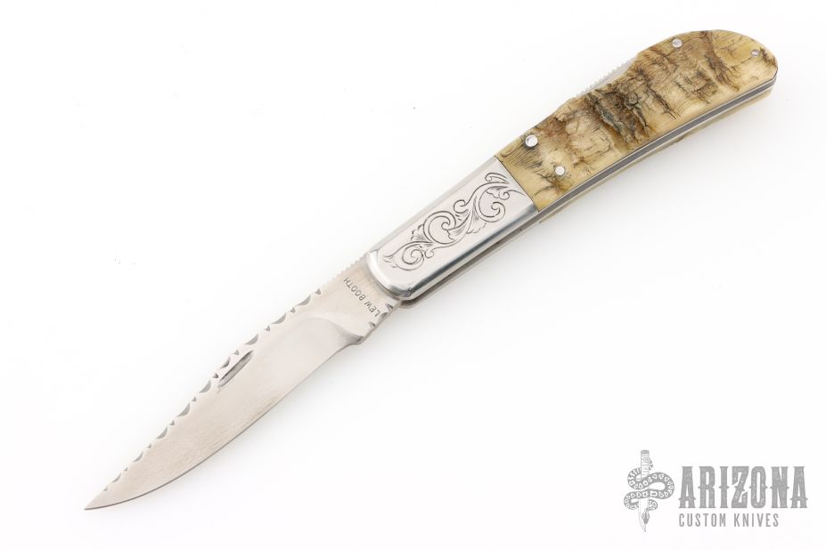 This lockback by Lew Booth features a hand rub satin finished blade with nail nick and file worked blade spine and notched thumb rest. The handle has engraved nickel silver bolsters, liners, horn covers, and notched steel spring. Comes with a soft pouch. Has a couple light scratches, excellent condition.