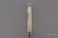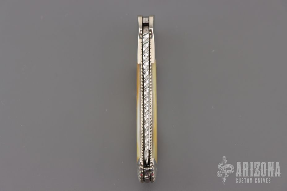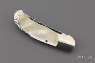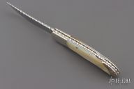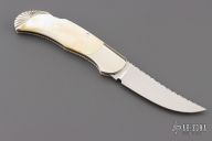 This Lockback by Ken Steigerwalt features a mirror polish finished blade with nail nick and fileworked spine. The handle has integral file worked nickel silver dovetail bolsters, gold lip pearl scales, fluted caps, and fileworked stainless steel backspacer. Nice lockup and blade seating. Comes in a soft pouch. Excellent condition.