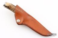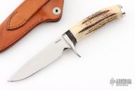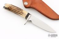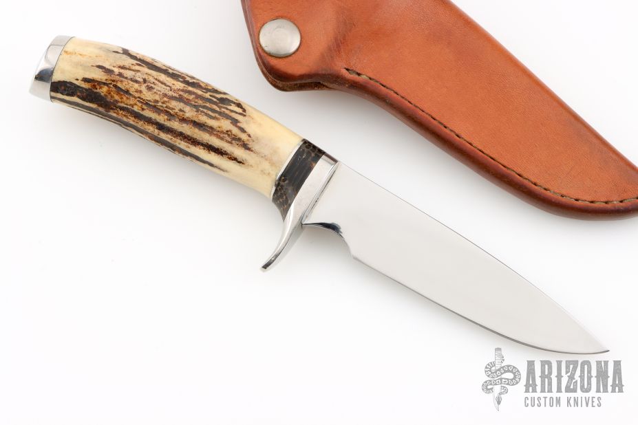This hunter by Harry Mitchell features a mirror polished blade with .239" blade stock and 1.098" blade depth, hidden tang construction. The handle has a nickel silver guard and butt, stag grip, nickel silver and palm wood spacers. Comes with a brown leather sheath. Has a few very light scratches, otherwise excellent condition.
