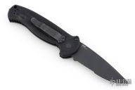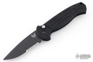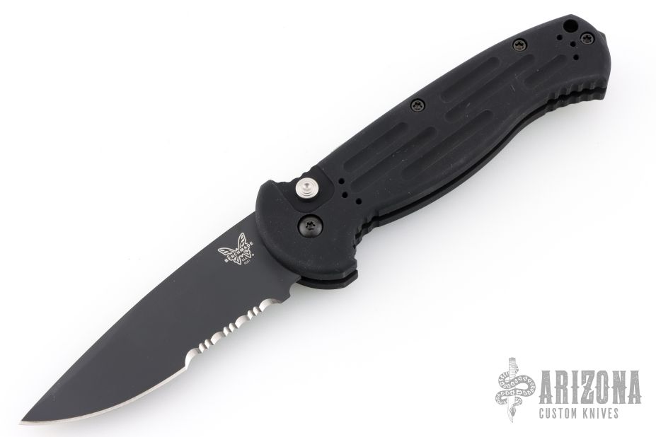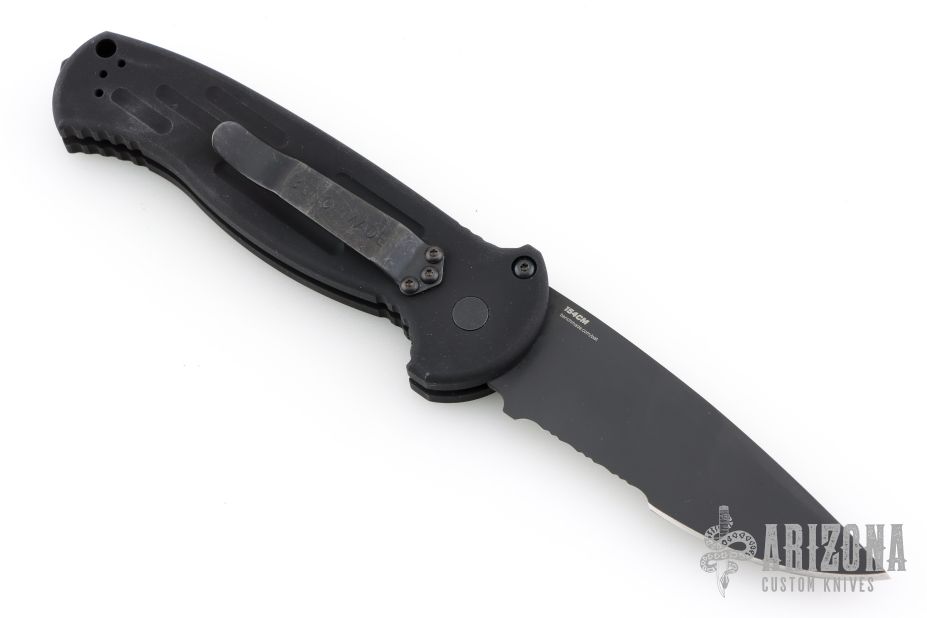 This 9051 AFO II auto from Benchmade has a black spear point partially serrated blade with false top edge. Black anodized aluminum handle. Integrated safety system. Black stainless steel clip - 4 way reversible, and lanyard hole. Comes with original box, sheath and papers. Excellent condition.
