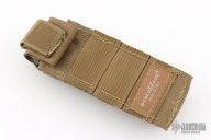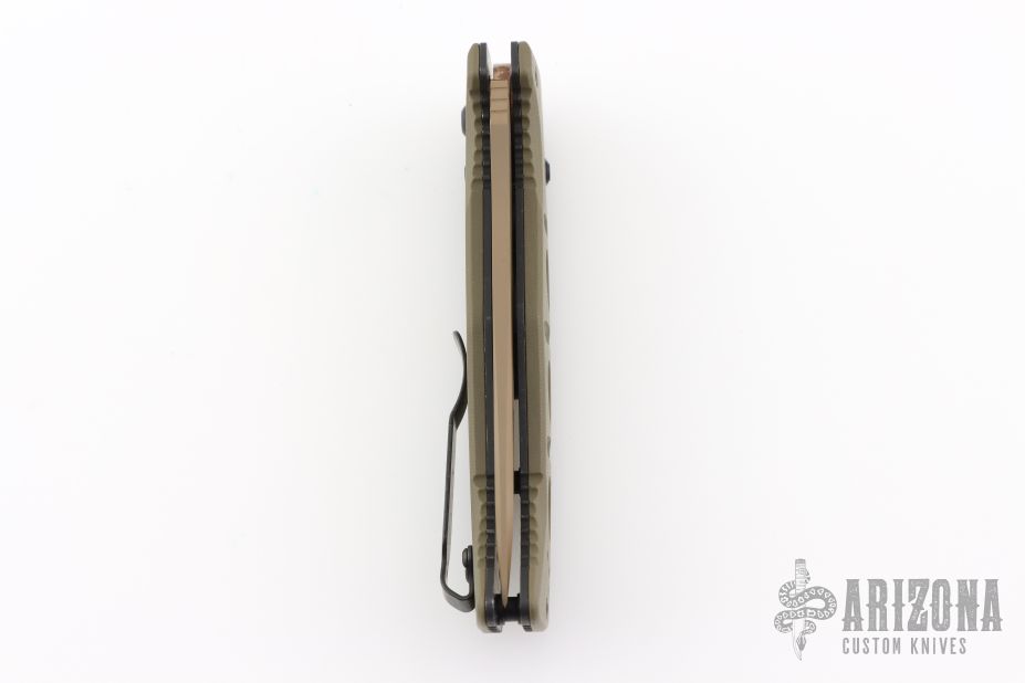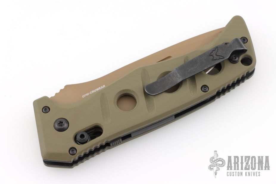 This Siebert designed 2750SFE-2 Adamas Auto Axis Lock has a FDE coated drop point blade with partial serrations, fullers and notched thumbrest. Handle is OD G-10 over black stainless steel liners, reversible tip up black stainless steel clip, and spine safety button.  Includes original tan nylon sheath. Comes with a Benchmade box and papers. Excellent condition.