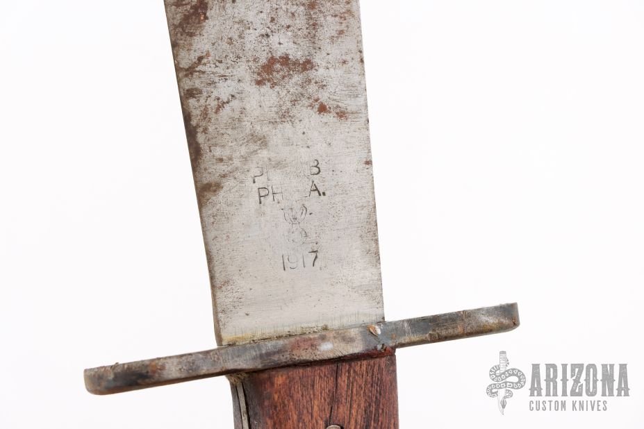 This example the wooden handle has a beautiful color, and is free from any major defects except for a crack at one of the pins near the butt, it is also missing the small brass butt plate, you can see where the pins holes were that held it on. The blade is marked near the cross guard with PLUMB / PHILA / FLAMING BOMB / 1917 on one side, and U.S. / 55149 on the reverse.