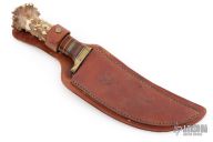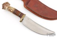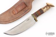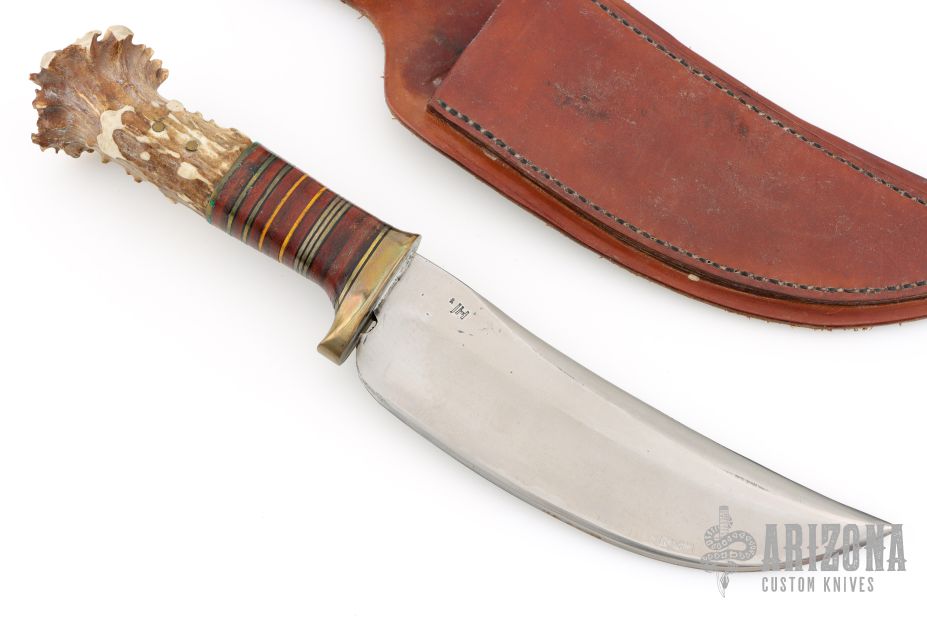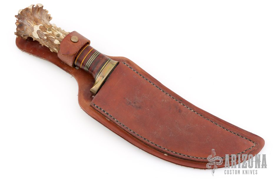 This camp knife by Handmade Classics features a satin finished blade with false top edge, .270" blade stock and 2.080" blade depth, hidden tang construction. The handle has a brass guard, crown stag butt, stacked leather grip with black/brass/yellow spacers. Comes with a brown leather sheath. Has light scratches, has some patina on the brass, the little black spots on the blade are actually forging marks, otherwise good condition.