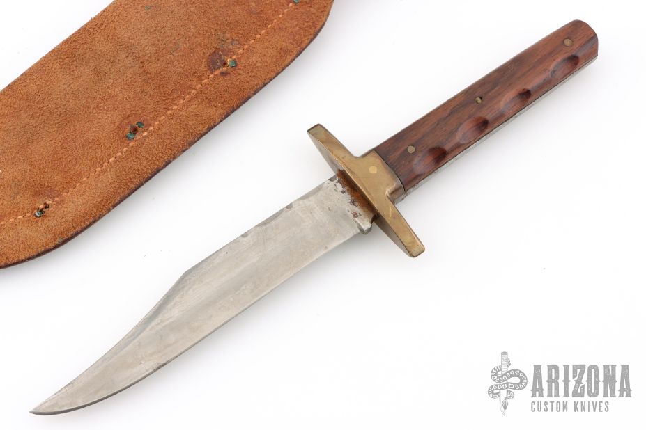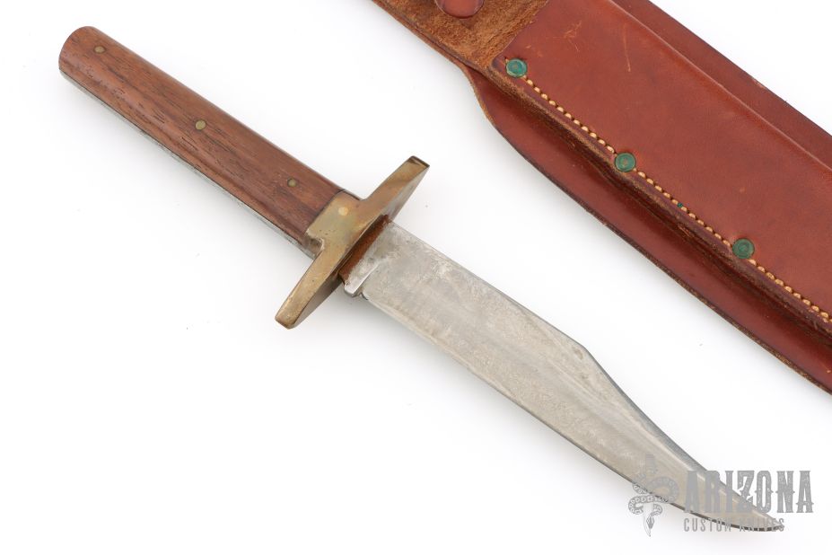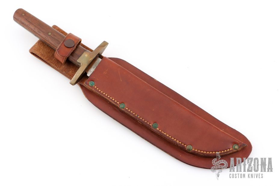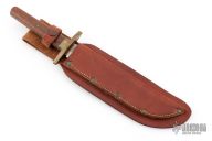 This antique bowie by J Nowill & Sons features a clip point blade with false top edge and fileworked spine, .168" blade stock and 1.045" blade depth, full tang construction. The handle has a brass guard, wood scales with right handed finger grooves, brass pins. Has some scratches and patina, some oxidation on the tang and ricasso, otherwise fair condition for its age. Comes with a HH Heiser brown leather sheath.