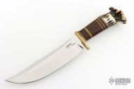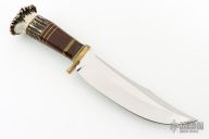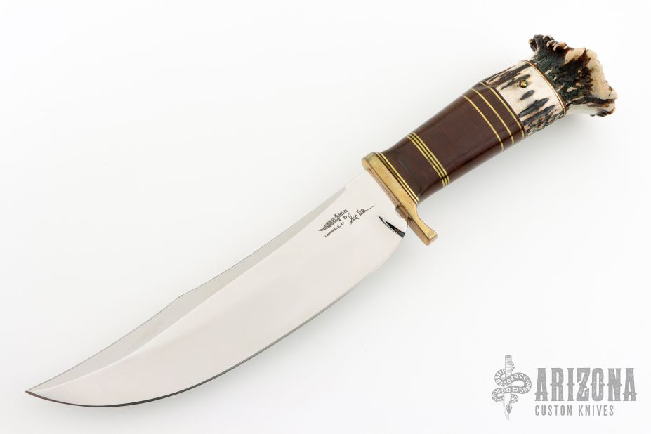 This custom Scagel style Bowie features a mirror polished blade with false top edge, .245" blade stock and 1.880" deep, hidden tang construction. The handle has brass guard, stacked leather handle with black and brass spacers, crown stag butt with a brass pin. Excellent condition. Comes with a zippered case.