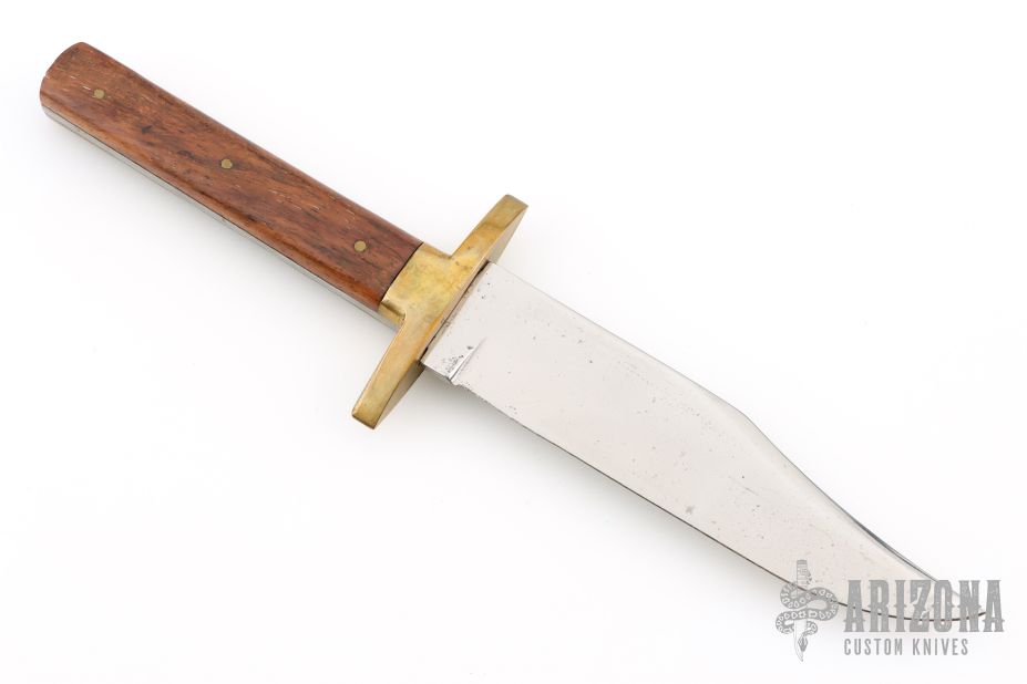 This Bowie Knife by J Nowill & Sons features a mirror polished blade with false top edge and fileworked spine, .156" blade stock and 1.224" blade depth, full tang construction. The hand has a brass guard with wood scales. Has some light scratches and patina, otherwise excellent condition for its age