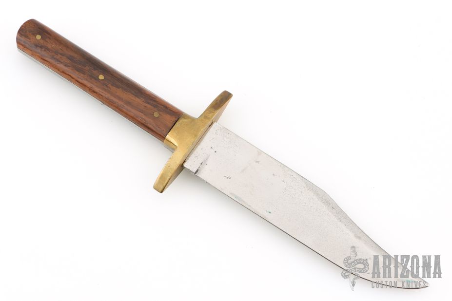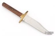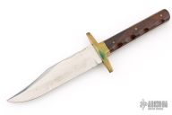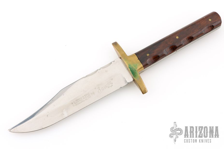 This Bowie Knife by J Nowill & Sons features a mirror polished blade with false top edge and fileworked spine, .156" blade stock and 1.221" blade depth, full tang construction. The hand has a brass guard with wood scales. Has some light scratches and patina, otherwise excellent condition for its age