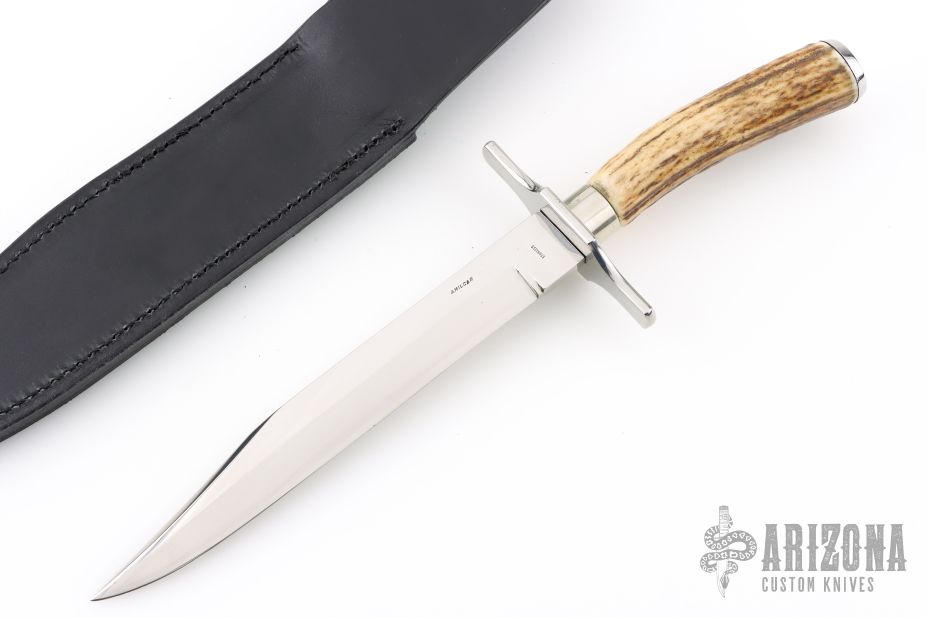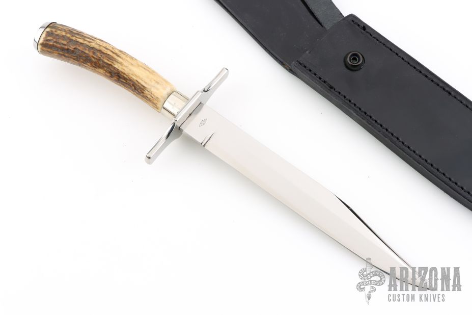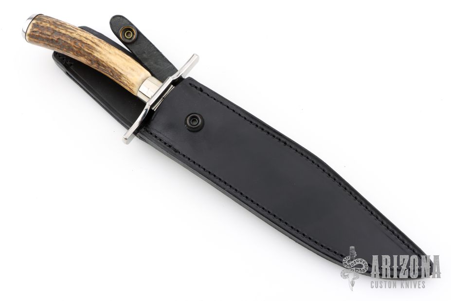 This bowie by "AMILCAR" (please let us know if you know who this maker is) features a mirror polished blade with false top edge, .224" blade stock and .941" blade depth, hidden tang construction. The handle has a stainless steel guard and butt with a stag grip. Comes with a black leather sheath, not original but fits nicely. Has a couple very light scratches, otherwise excellent condition.