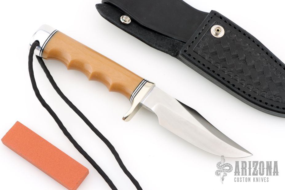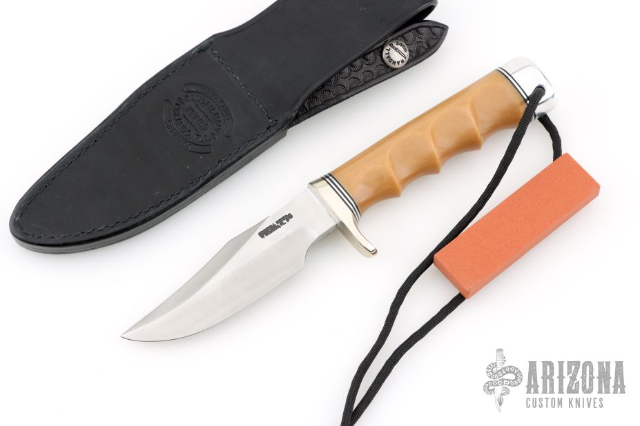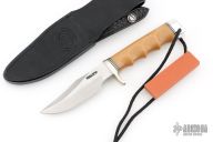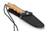 This Stanaback Special from Randall Made Knives features a satin finished clip point blade with sharpened top edge and notched thumbrest, .226" blade stock and 1.182" blade depth, hidden tang construction. The handle has a nickel silver guard, bone linen micarta grip with finger grooves, black/duralumin spacers, duralumin butt with lanyard hole. Includes a hand tooled black leather sheath with belt loop and original paper wrapping. New from maker!