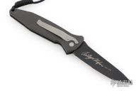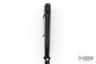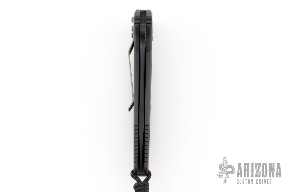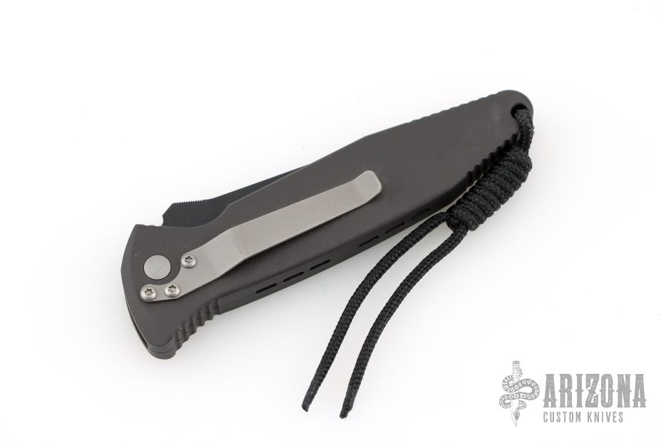 This Mini Socom Auto has a black tanto partially serrated blade with notched thumbrest. Handle is black aluminum with non-slip inserts, lanyard, and bead blasted stainless steel tip down clip. Has a couple light scuffs, otherwise excellent condition.