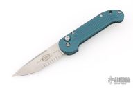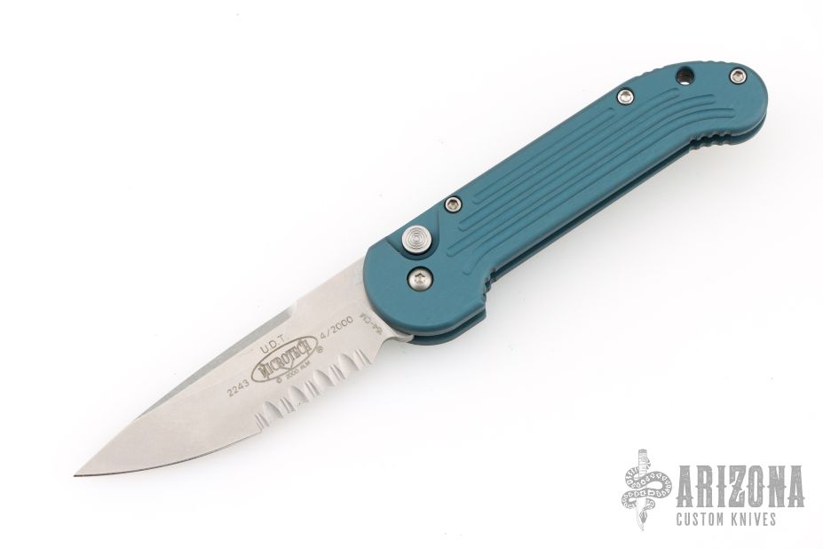 This UDT by Microtech has a stonewash partially serrated blade. Stainless steel clip, tip up carry. Blue posts. Teal aluminum handle with lanyard hole. Side opening coil-spring automatic. Dated 4/2000. Serial #2243. Hard to find. Comes with original sheath. Has a couple light scuffs, otherwise excellent condition.