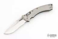 This Amphibian by Marfione Custom Knives features mirror polished blade with satin flats, dual thumbstuds, and a 3/4" sharpened top edge.  The handle has a double vapor blast titanium frame with two-tone hardware.  Includes the original box, zipper case and COA.  Dated 06/2023.  Excellent Condition.