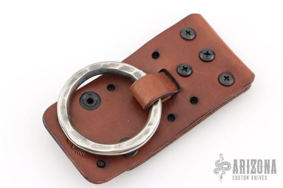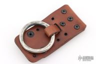 What better way to easily carry around your tomahawk or ax with fast access than with a traditional baldric ring, done RMJ style?! Simply drop your tomahawk handle first through the ring, and you have a nice and secure (but easy to grab) tool. Even though the traditional ways can be great, we still bring some 21st century to this system. The system is built on a leather panel that features dual snap loop straps that can be used to mount the ring to belts up to 2 inches wide, as well as mount the panel directly onto PALS webbing with the built in MOLLE straps. You can even remove the ring completely to bolt onto other gear. The ring itself has in inside diameter of 2 inches, so will accommodate a wide variety of handle profiles. The saddle stitched construction means that it is super durable and will still hold together even if the binding is damaged.