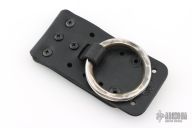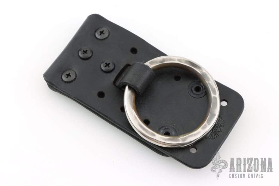 What better way to easily carry around your tomahawk or ax with fast access than with a traditional baldric ring, done RMJ style?! Simply drop your tomahawk handle first through the ring, and you have a nice and secure (but easy to grab) tool. Even though the traditional ways can be great, we still bring some 21st century to this system. The system is built on a leather panel that features dual snap loop straps that can be used to mount the ring to belts up to 2 inches wide, as well as mount the panel directly onto PALS webbing with the built in MOLLE straps. You can even remove the ring completely to bolt onto other gear. The ring itself has in inside diameter of 2 inches, so will accommodate a wide variety of handle profiles. The saddle stitched construction means that it is super durable and will still hold together even if the binding is damaged.
