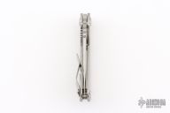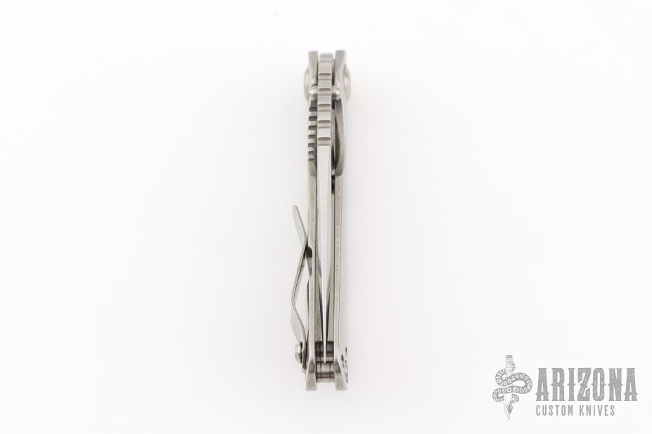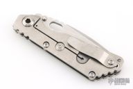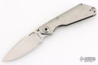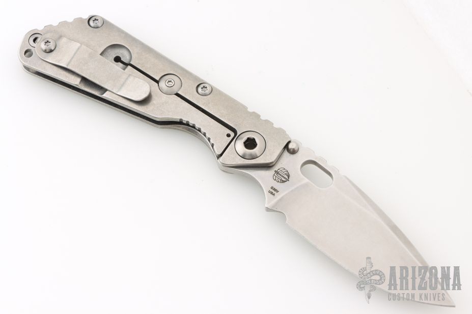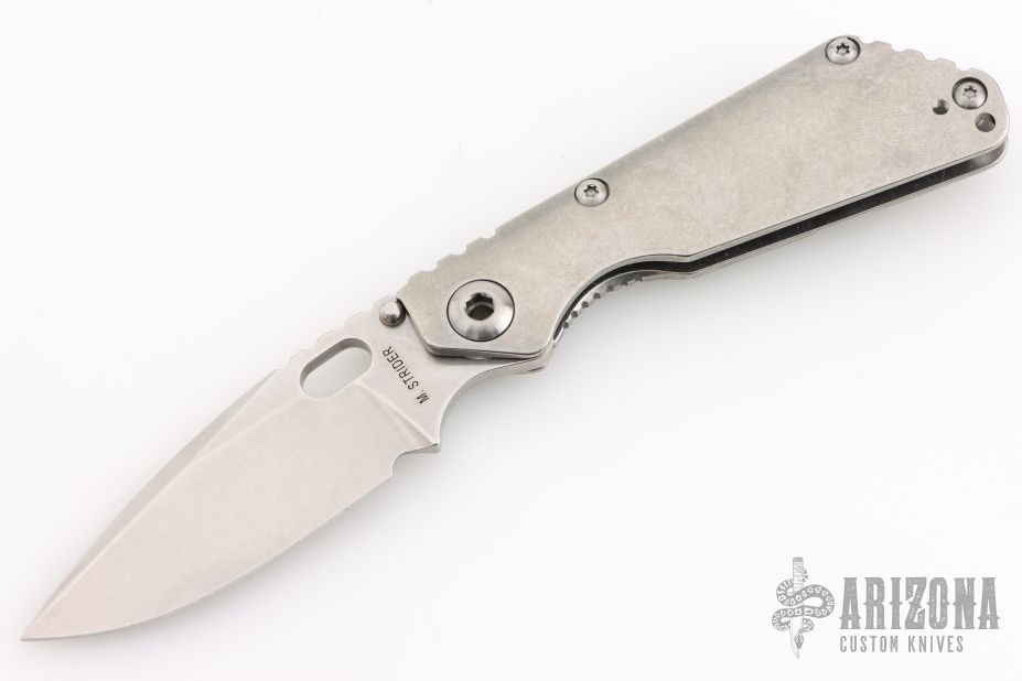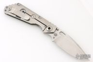 This Mick Strider Performance series SNG framelock folder features a stonewashed drop point blade with thumbhole and notched thumbrest. The handle has a stonewashed titanium frame with titanium clip, tip up carry. Jimping on blade spine. Includes Hinderer "Lock Bar Stabilizer" for maximum reverse lock retention. Nice lockup, detent, and blade seating. New condition. Comes with a zippered case.