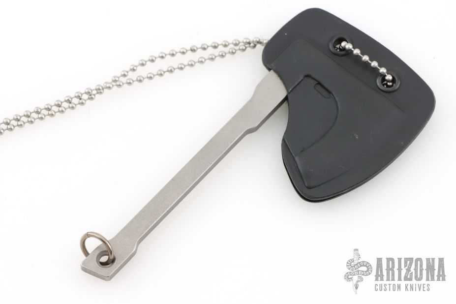 The Mortifer Mini Tomahawk is more than just a pendant, it features a live edge that can be used as a small utility knife, great for quick tasks like opening boxes or scoring materials. The Mortifer comes with a Kydex sheath and ball chain so it can be worn as a pendant.  The sheath or the ring through the the handle can be attached to your keys, or a lanyard, etc.
