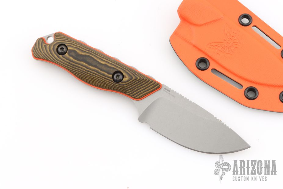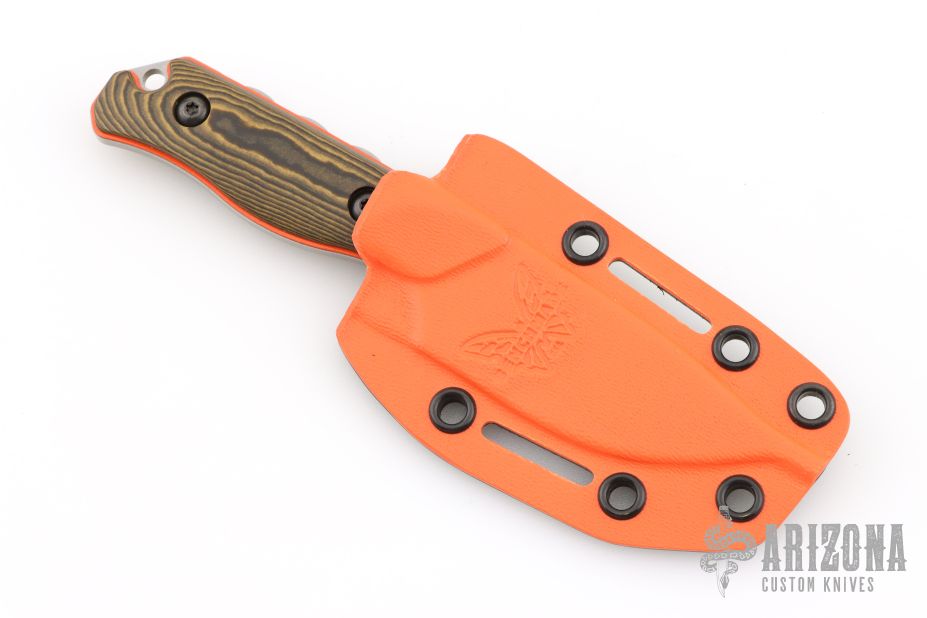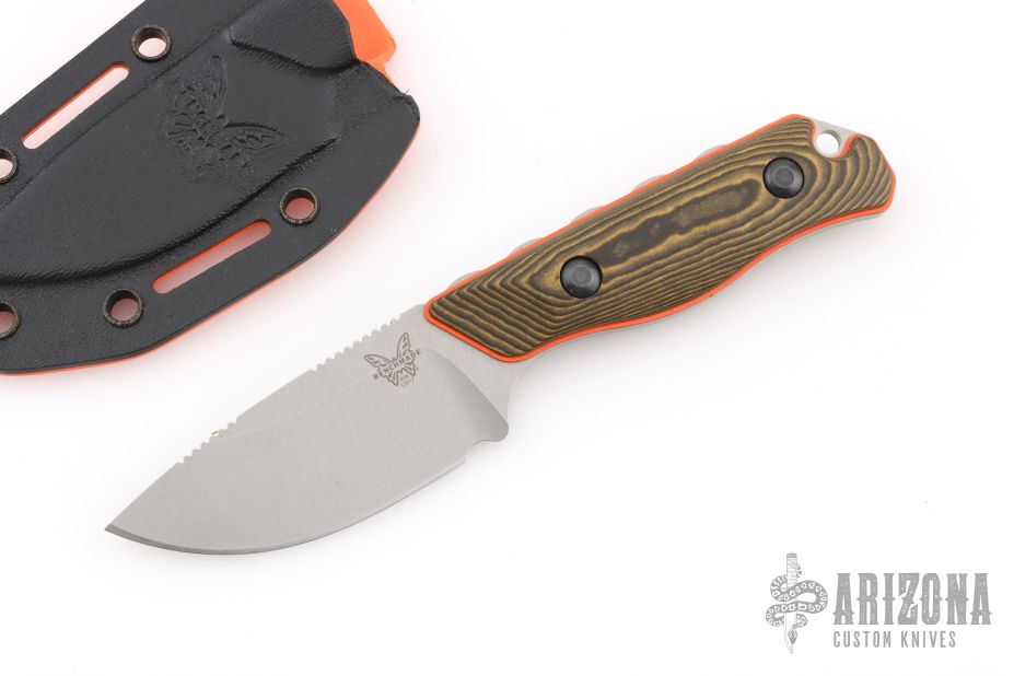 This knife from Benchmade features a stonewashed drop point blade with a full tang construction. The handle has paper micarta scales over G-10 liners. Includes a Kydex sheath and the original box. Excellent Condition.